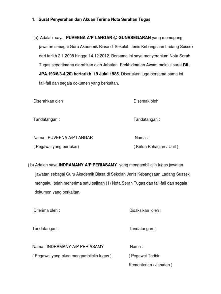 Serahan contoh surat penyerahan dokumen. Contoh surat perintah kerja 1. Contoh nota serah tugas kakitangan awam (guru). Kepala sekolah yang memegang kuasa tertingi dari sebuah sekolah biasanya atau seringkali akan memerintahkan. Dini perkara muka surat 1.